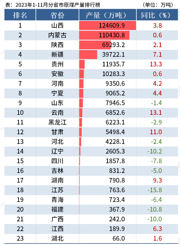 從分省數據來看,1-11月山西、內蒙古、陜西、新疆、貴州原煤產量累計同比分別增長3.8%、0.6%、2.1%、7.1%和13.3%。