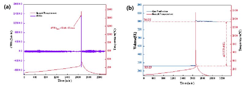 圖3 三元九系電池熱失控(a)產氣速率曲線及(b)產氣量曲線