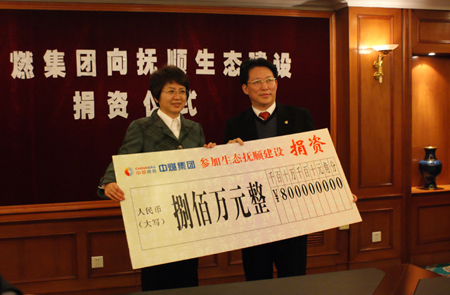 2012年2月11日下午,中燃集團向撫順生態建設捐資儀式在撫順友誼賓館舉行。撫順市市長王桂芬,副市長杜曉航,中燃集團董事總經理兼執行總裁龐英學,副總裁袁賡、袁振才,撫順中燃城市燃氣發展有限公司總經理艾立民等出席了捐資儀式。