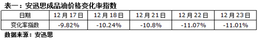 ICIS安迅思2015年12月24日訊——過去一周,美國原油庫存增長至歷史高點,美聯儲加息后美元匯率上漲而打壓以美元計價的商品期貨, WTI及布倫特原油連連下跌;安迅思監測數據顯示,12月23日,安迅思成品油價格變化率指數為-11.01%,國內汽柴油零售下調幅度約255元/噸。