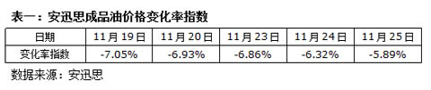 ICIS安迅思2015年11月26日訊——本輪調價周期內,國際原油價格低位徘徊,對市場超供的擔憂抵消了地緣政治緊張升級的影響;加之美國原油庫存連續八周增長,國際油價難有大幅攀升機會。安迅思監測數據顯示,11月25日,安迅思成品油價格變化率指數為-5.89%,國內汽柴油零售下調幅度約160元/噸。