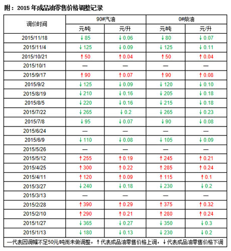 ICIS安迅思2015年11月17日訊——根據國家發改委本周二(11月17日)下午17時發布的通知,汽柴油最高零售價下調兌現,汽油下調85元/噸,柴油下調80元/噸,折合升價為汽油0.06元/升,柴油為0.07元/升,調價執行時間為11月17日24時。