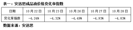 ICIS安迅思2015年10月29日訊——過去一周,受到中國GDP增幅減緩、伊朗將增加出口原油、美國原油庫存大幅度增長等因素的影響,WTI和Brent原油期貨持續下滑。安迅思監測數據顯示,10月28日,安迅思成品油價格變化率指數為-4.83%,折合國內汽柴油零售下調幅度約145元/噸。