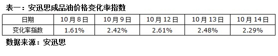 ICIS安迅思2015年10月15日訊——過去一周,敘利亞局勢動蕩加劇了石油市場不安,加之美元匯率下跌,令國際油價震蕩中反彈。安迅思監測數據顯示,10月14日,安迅思成品油價格變化率指數為2.29%,折合國內汽柴油零售上調幅度約60元/噸。