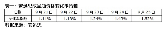 ICIS安迅思2015年9月28日訊——過去一周,美聯儲維持利率不變、美國鉆井平臺連續三周減少,令油價一度反彈,然而美國原油產量略微增加、美國原油加工量季節性下降,市場仍然擔心超供壓力,中國制造業指數也打壓石油市場氣氛。安迅思監測數據顯示,9月25日,安迅思成品油價格變化率指數為-1.52%,折合國內汽柴油零售下調幅度約45元/噸。