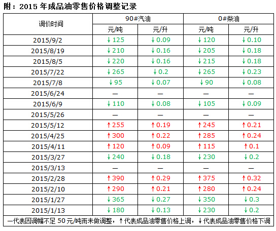 ICIS安迅思2015年9月1日訊——根據國家發改委本周二(9月1日)下午17時發布的通知,汽柴油最高零售價下調兌現,其中汽油下調125元/噸,柴油下調120元/噸,折合升價分別是0.09元/升和0.10元/升,調價執行時間為9月1日24時。2015年內成品油零售限價一共下調9次,此次六連跌兌現后,局部地區零售價格將出現“4”開頭。