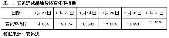 . ICIS安迅思2015年8月31日訊——國際油價跌跌不休,國內成品油零售價格處于下滑通道,本周二國內汽柴油零售價繼續下跌。安迅思監測數據顯示,8月28日,安迅思成品油價格變化率指數為-7.52%,國內汽柴油零售下調幅度約155元/噸。