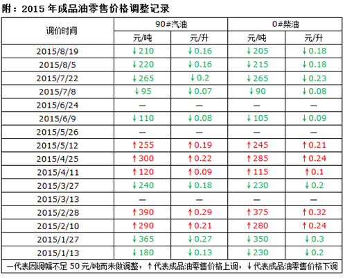 在本輪調價周期內,歐美原油期貨價格雙雙走低,WTI跌至6年以來最低,Brent則在多次50美元/桶以下震蕩。美國原油產量、成品油庫存增加以及石油鉆井平臺連續3周增加,加上人民幣意外貶值,歐佩克原油日產量增長至三年以來最高,石油市場氣氛受到打壓。