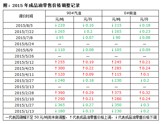 根據國家發改委本周二(8月4日)下午17時發布的通知,汽柴油最高零售價下調兌現,其中汽油下調220元/噸,柴油下調215元/噸,折合升價分別是0.16元/升和0.18元/升,調價執行時間為8月4日24時。從6月份起,成品油零售限價進入下行通道,截止目前一共下調4次,汽油累計下調690元/噸,折合升價為0.51元/升;柴油累計下調675元/噸,折合升價為0.58元/升。經此后,93#汽油零售價格再度回歸5元/升的時代。