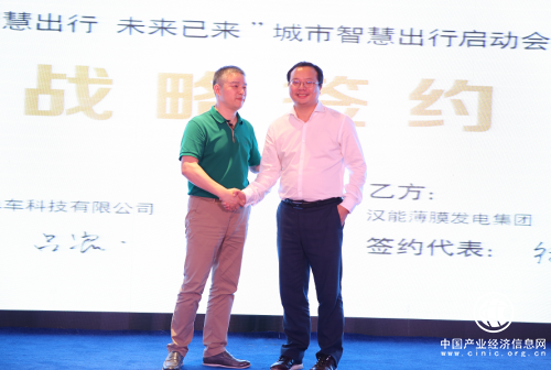 漢能薄膜發電集團副總裁徐曉華(右)浙江名天動力單車科技有限公司董事長呂宏(左)