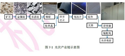 圖7-1給出了光伏產業的從礦石到光伏電站的主產業鏈。從圖中可見,光伏制造的產業鏈很長,從礦石、金屬硅冶煉、多晶硅生產、多晶硅鑄錠、硅片、電池片、光伏組件還有逆變器等各環節產品的生產制造。