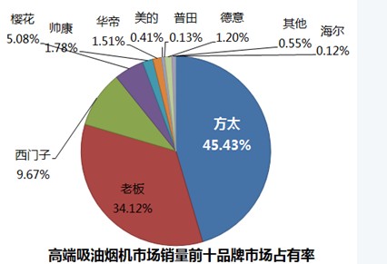 中國行業企業信息發布中心公布了2013年油煙機行業的最新數據,在高端吸油煙市場份額排名中,領導品牌方太毫無懸念地以45.43% 的份額雄踞榜首,繼續穩坐高端廚電市場頭把交椅。這一結果與此前權威市場調研機構中怡康公布的市場排名完全一致。根據中怡康不久前發布的數據:2013 年,方太以零售量占比44.81%、零售額占比45.02%的傲人業績,直接超越排名2-4位企業的市場占比總和,創下“10連冠”紀錄,展現出高端廚電霸主的絕對領先優勢。