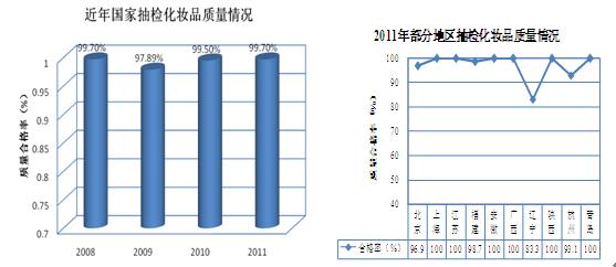 近年來,全國范圍內抽檢化妝品的質量合格率均處于較高水平。2011年國家質檢總局抽檢化妝品的質量合格率為99.7%。化妝品行業產品的較高質量水平與國家的質監重視、百姓的密切關注以及企業的高度責任感密切相關。消費者可放心購買或使用大、中型企業生產的化妝品行業產品。