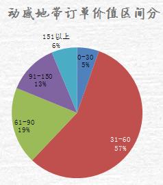 移動動感地帶禮品訂單價值:0-30元的僅占5%,57%集中在31-60元之間,61-90元的占19%,91-150元占13%,151元以上的占6%。