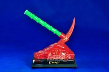 富貴紅陶瓷作品《歲月如歌》是為紫金礦業集團股份有限公司設計創作。紫金礦業集團股份有限公司位于福建省上杭縣,成立于1986年,現是中國最大的黃金生產企業、第二礦產銅生產基地、第六鋅業生產企業和控制金屬礦產資源最多的企業之一。紫金的輝煌業績正是紫金人二十多年來共同拼搏的結果。陶瓷作品《歲月如歌》取形于福建原始的、至今民間還仍在使用的拓荒工具鐵鎬頭,以此象征紫金人奮發有為的開拓精神。鎬柄的造型是一支竹簫,將這種開拓精神詩意化了,精神如悠悠簫音回蕩在閩西的崇山峻嶺之間。