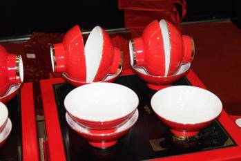 富貴紅一是以品牌陶瓷藝術品和工藝品進行為期三天的現場展示,以富貴紅精美的陶瓷工藝品烘托和點綴大會的現場氛圍。富貴紅公司此次展示的均是由富貴紅官窯文化研究所新近研發的日用陶瓷工藝品,款式現代、時尚,促進了陶瓷與餐飲在文化上的互動,成為大賽現場的一大熱點。二是借勢“富貴紅”品牌在文化上的影響力,指定富貴紅陶瓷藝術品和日用工藝品作為大賽的貴賓禮品。