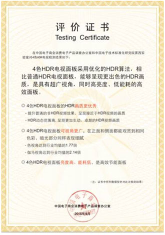繼世界上最大的測試/檢驗機構Intertek認證4色4K面板能源效率優秀之后,4色4K面板再次獲得了中國電子商會消費電子產品調查辦公室聯合中國電子技術標準化研究院賽西實驗室頒發的評價證書。內容如下:“4色HDR電視面板采用優化的HDR算法,比普通HDR電視面板能夠呈現更出色的HDR畫質,是具有超廣視角、高亮度、低能耗的高效面板。”可以看出,4色4K面板在畫質和能效方面都獲得了專業機構肯定,成為了畫質、能效雙重認證的高效面板。