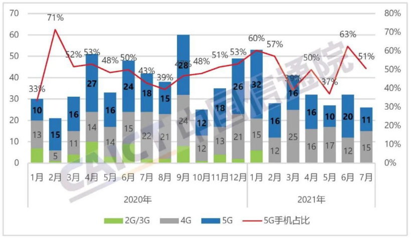 2021 年 7 月,國內市場手機出貨量 2867.6 萬部,同比增長 28.6%,環比增長 11.7%,其中,5G 手機 2283.4 萬部,同比增長 64.1%,環比增長 15.4%,占同期手機出貨量的 79.6%。