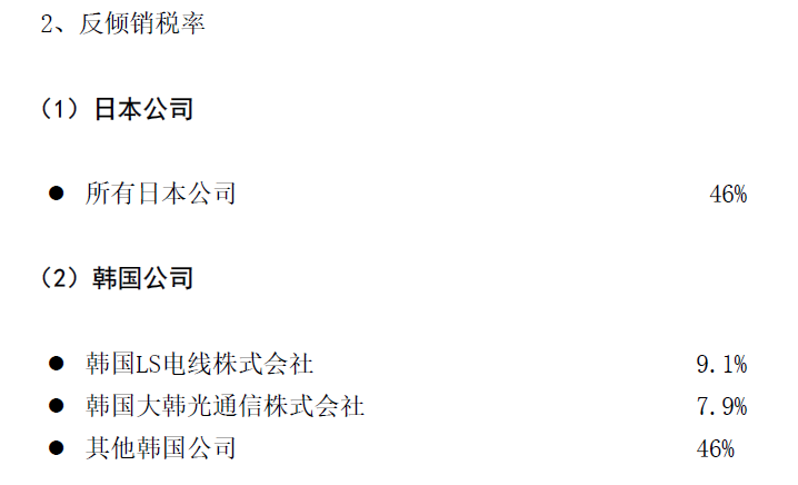 公告顯示,2005年1月1日,商務部發布2004年第96號公告,決定對原產于日本和韓國的進口非色散位移單模光纖征收反傾銷稅。經期間復審及期終復審,該措施將于2021年12月31日到期,目前日本公司稅率為46%,韓國公司稅率為7.9%-46%。