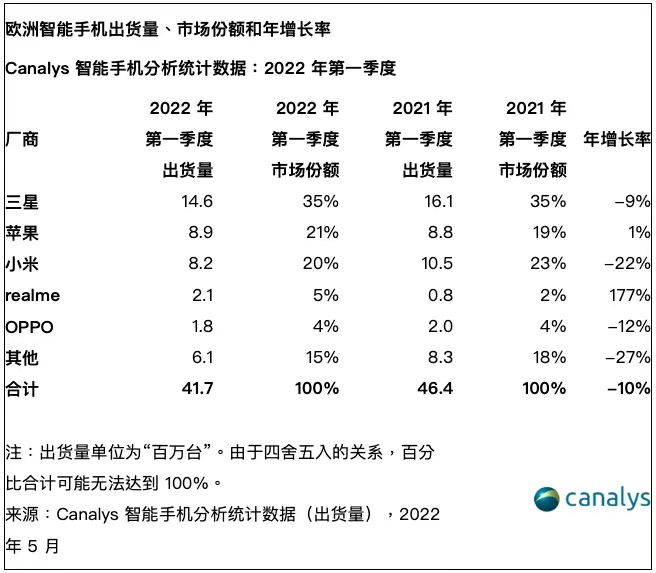 2022年第一季度,歐洲智能手機市場出貨量排名前五的廠商分別為:三星、蘋果、小米、realme、OPPO。