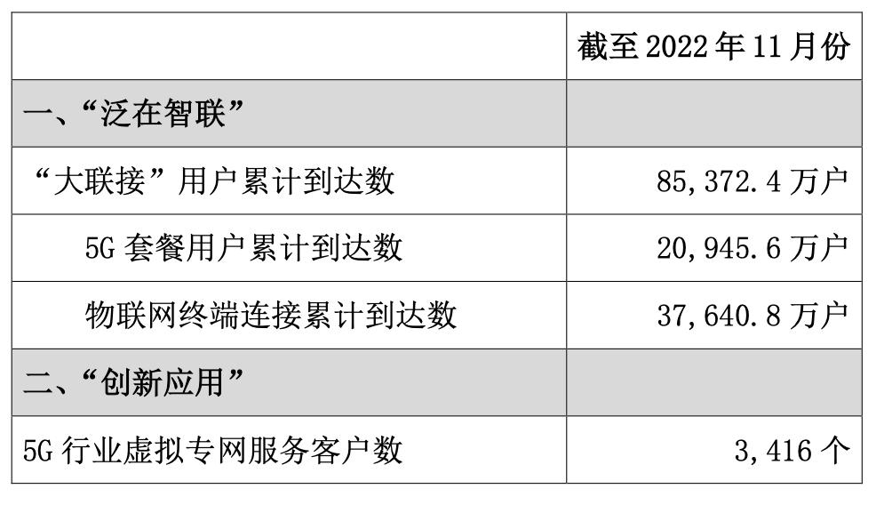 “泛在智聯”方面,截至2022年11月,中國聯通“大聯接”用戶累計達到85372.4萬戶,其中5G套餐用戶累計達到20945.6萬戶,物聯網終端連接累計達到37640.8萬戶。截至2022年10月,5G套餐用戶累計達到20500.5萬戶,物聯網終端連接累計達到37349.2萬戶。這也意味著,中國聯通11月5G套餐用戶和物聯網終端連接數新增數量分別為445.1萬戶和291.6萬戶。
