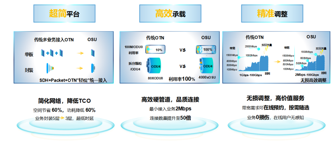 在引入OSU技術后,新一代光網絡能夠支持EoOSU、EoO、EoS功能,可以支持業務的端到端一鍵開通、時延地圖、以及精細化的帶寬資源管控等,為企業數字化轉型提供極致的高品質網絡體驗,極大促進運營商政企業務的發展。同時,OSU技術可以很好地解決傳統VC方案低階交叉能力不足的痛點,有效緩解核心機房配套壓力,助力SDH退網,實現節能降碳。