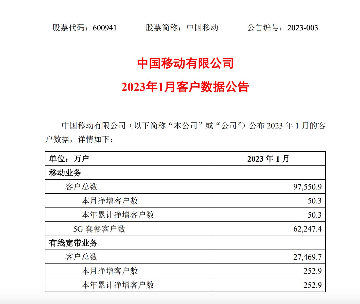 中國移動近日公布2023年1月份運營數據,當月,中國移動移動客戶數凈增50.3萬戶,用戶總數達到9.75509億戶。