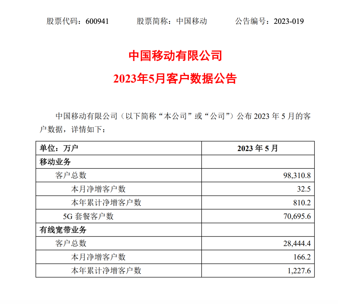 中國移動今日公布2023年5月份運營數據,當月,中國移動移動客戶數凈增32.5萬戶,用戶總數達到9.83108億戶。