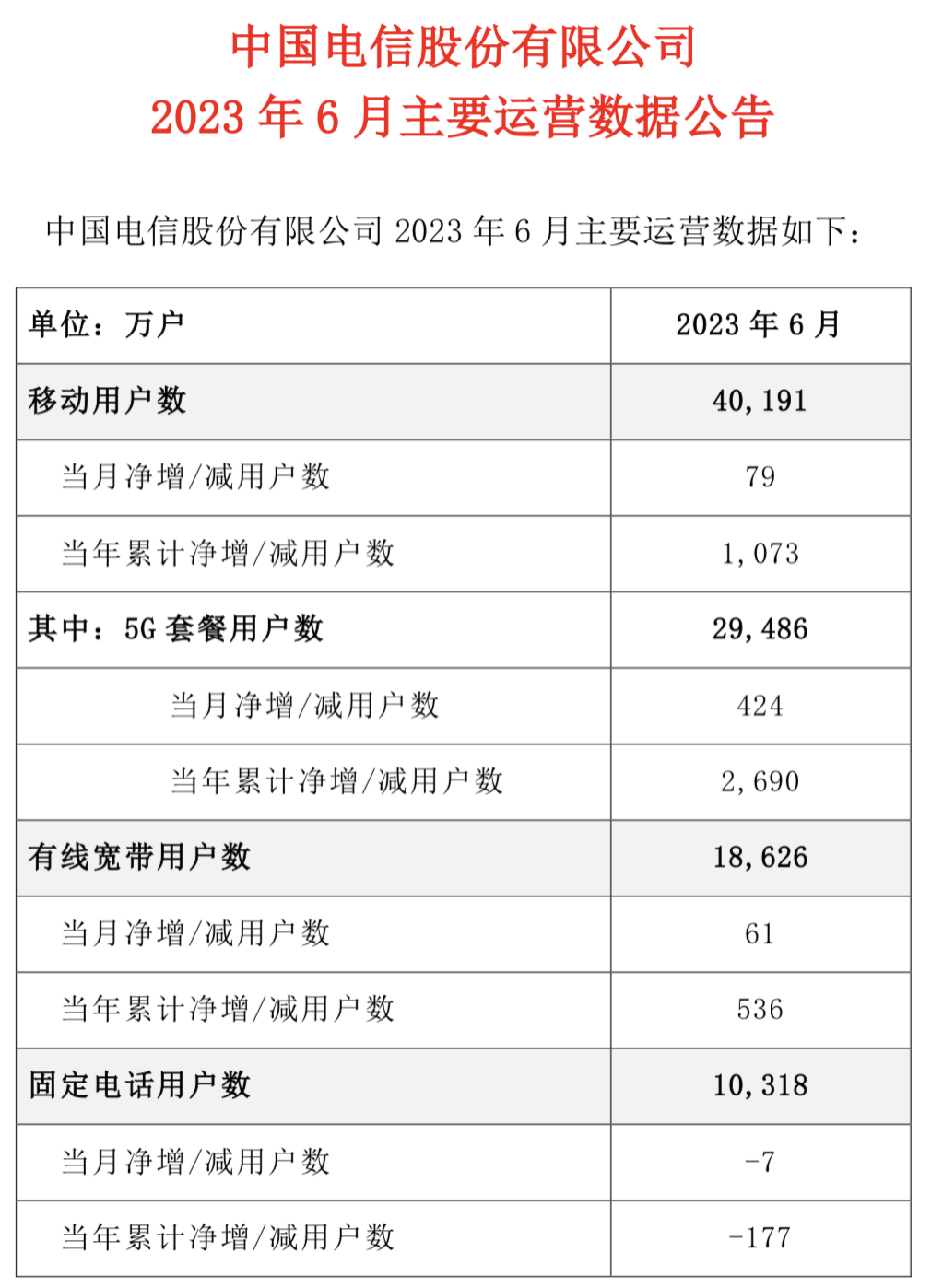 7月20日,中國電信公布了2023年6月主要運營數據。當月,中國電信移動用戶數凈增79萬戶,移動用戶數累計4.0191億戶。其中,5G套餐用戶凈增424萬戶,5G套餐用戶數累計2.9486億戶。