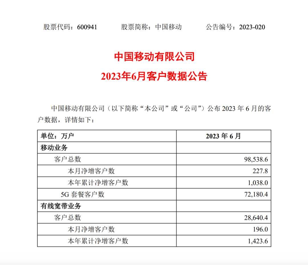 中國移動20日公布2023年6月份運營數據,當月,中國移動移動客戶數凈增227.8萬戶,用戶總數達到9.85386億戶。