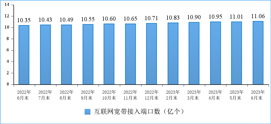 10G PON端口數超2千萬。截至6月末,全國互聯網寬帶接入端口數量達11.1億個,比上年末凈增3457萬個。其中,光纖接入(FTTH/O)端口10.6億個,比上年末凈增3855萬個,占互聯網寬帶接入端口的96.2%。截至6月末,具備千兆網絡服務能力的10G PON端口數達2029萬個,比上年末凈增506.5萬個。
