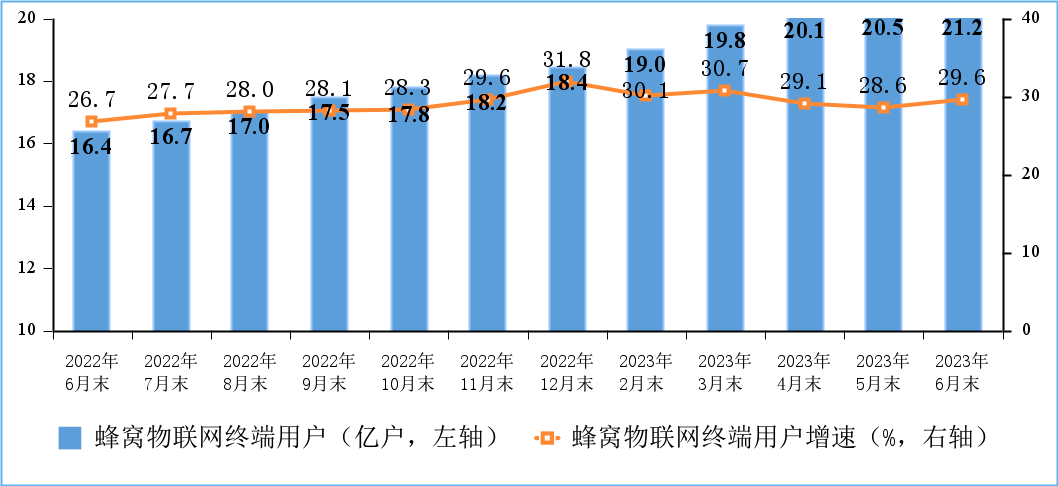 蜂窩物聯網用戶較快增長,IPTV用戶穩步增加。截至6月末,三家基礎電信企業發展蜂窩物聯網終端用戶21.2億戶,比上年末凈增2.79億戶,占移動網終端連接數(包括移動電話用戶和蜂窩物聯網終端用戶)的比重達55.4%。IPTV(網絡電視)總用戶數達3.92億戶,比上年末凈增1148萬戶。