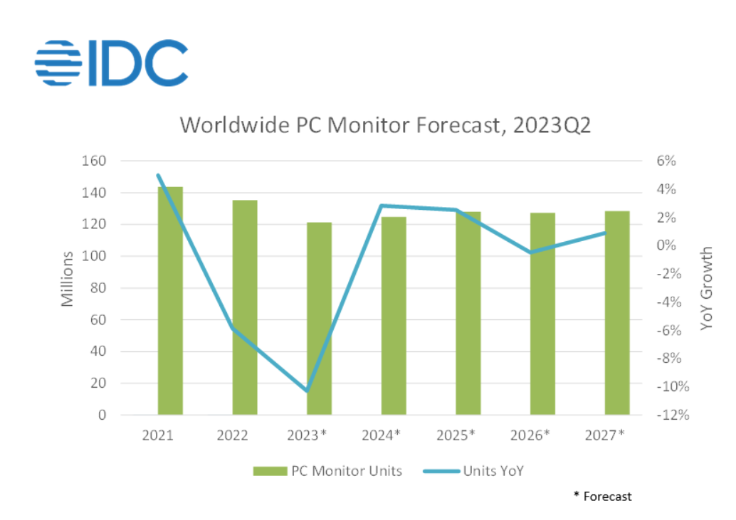 研究機構 IDC 發布數據顯示,2023 年第二季度,全球 PC 顯示器市場出貨量同比減少 17.1%,為 2990 萬臺,略微超出市場預期,但顯示器市場仍未恢復至 2019 年的水平。