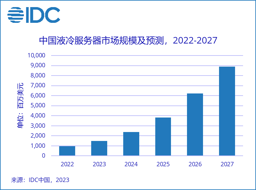 市場研究公司IDC發布了最新《中國半年度液冷服務器市場(2023上半年)跟蹤》報告。數據顯示,中國液冷服務器市場在2023年仍將保持快速增長。2023上半年中國液冷服務器市場規模達到6.6億美元,同比增長283.3%,預計2023年全年將達到15.1億美元。IDC預計,2022-2027年,中國液冷服務器市場年復合增長率將達到54.7%,2027年市場規模將達到89億美元。