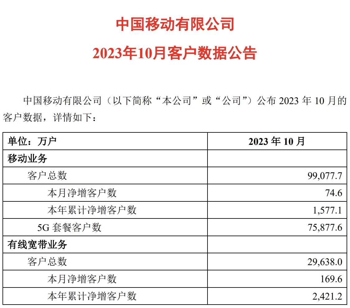 中國移動近日公布2023年10月份運營數據,當月,中國移動移動客戶數凈增74.6萬戶,用戶總數達到9.90777億戶。