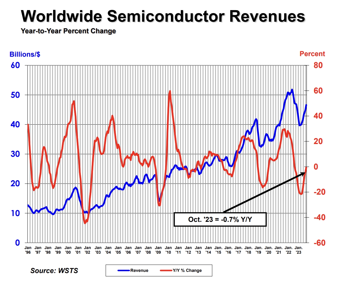 半導體產業協會(SIA)宣布,2023年10月全球半導體產業銷售總額為466億美元,較2023年9月的449億美元增長3.9%,但較2022年10月的469億美元下降0.7%。