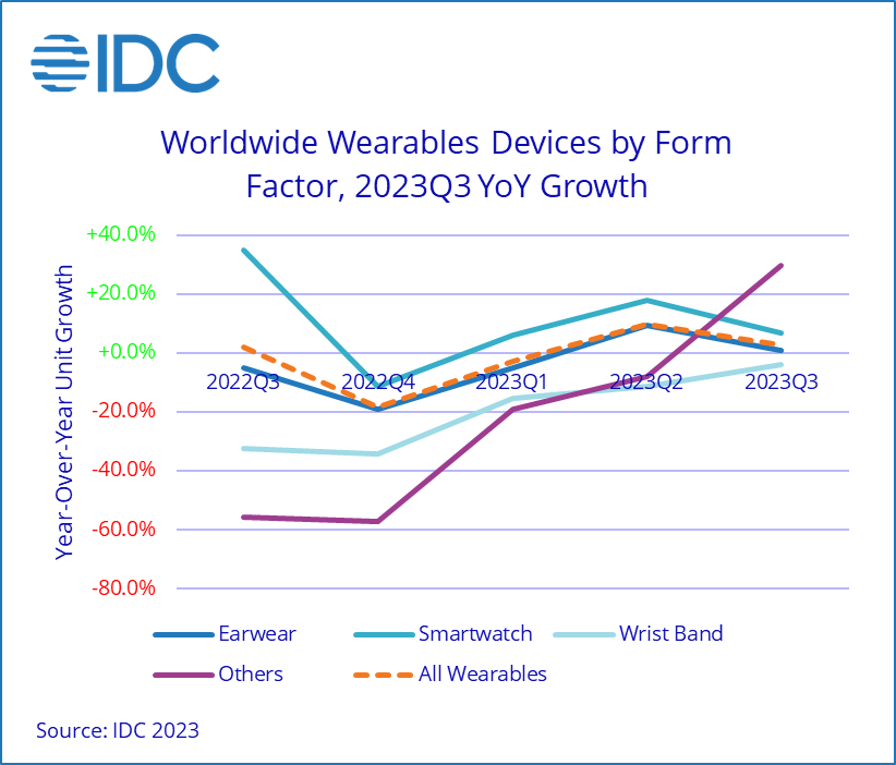 據IDC最新數據,2023年第三季度全球可穿戴設備出貨量同比增長2.6%,達到1.484億件的歷史最高水平。這種增長在很大程度上歸功于小品牌和新興品類的崛起。