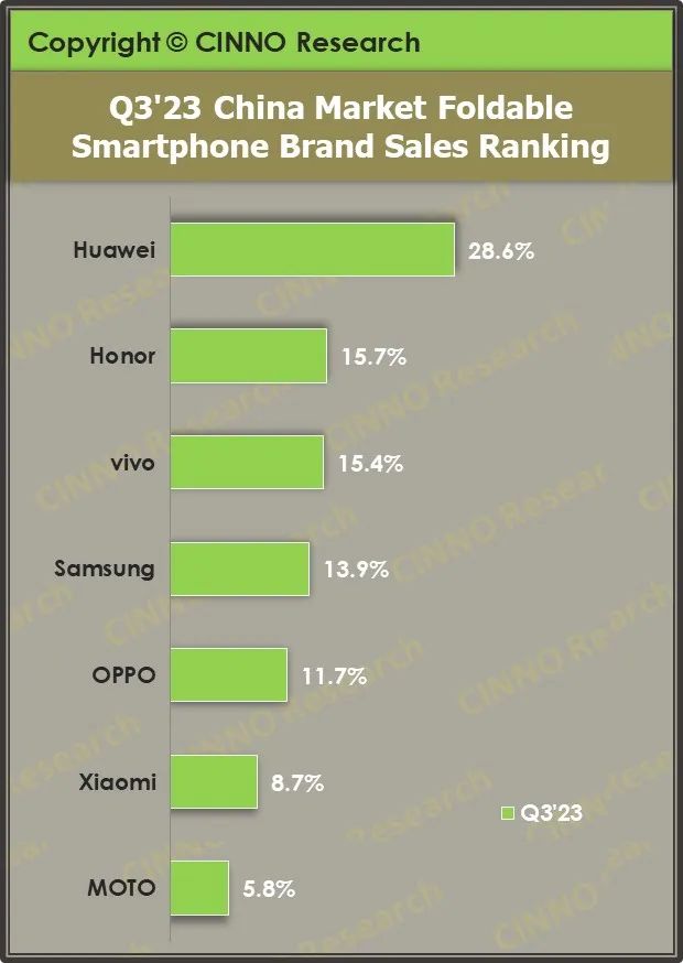 CINNO Research指出,從市場份額來看,2023年第三季度,華為位居國內市場份額No.1,市場份額高達28.6%,持續引領中國折疊手機市場,主要得益于Mate X3/ Pocket S良好的市場表現及Mate X5系列的上市。