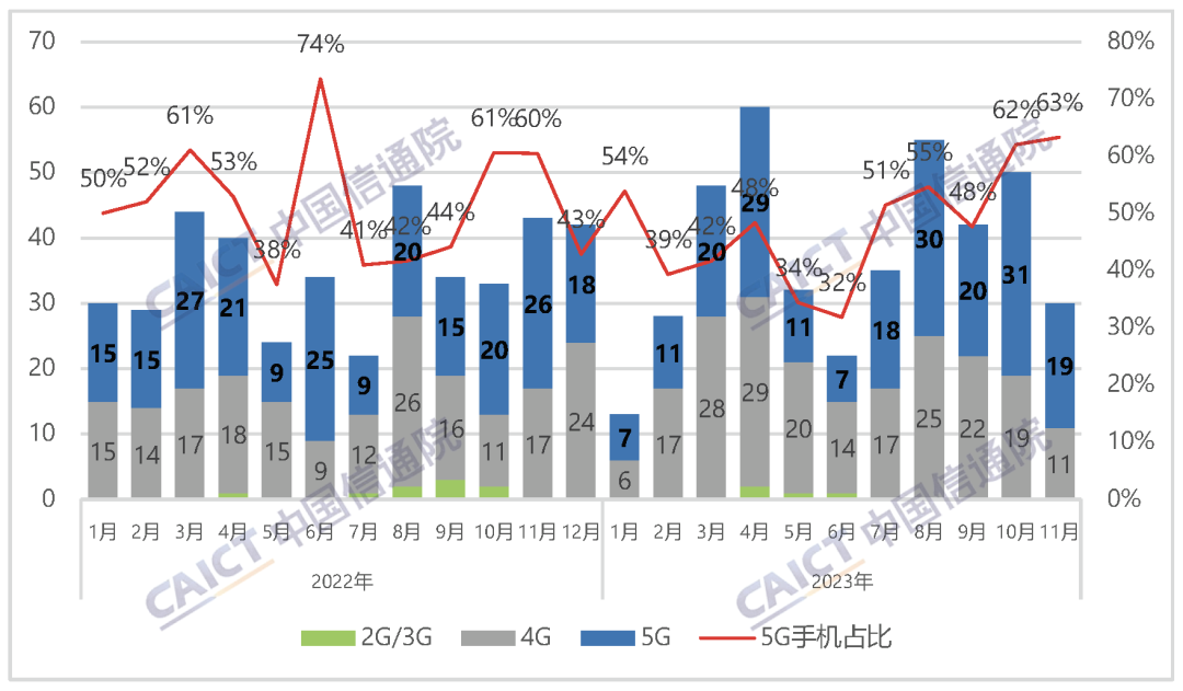 中國信通院今日發布了2023年11月國內手機市場運行分析報告,2023年11月,國內市場手機出貨量3121.1萬部,同比增長34.3%,其中,5G手機2709.2萬部,同比增長51.2%,占同期手機出貨量的86.8%。