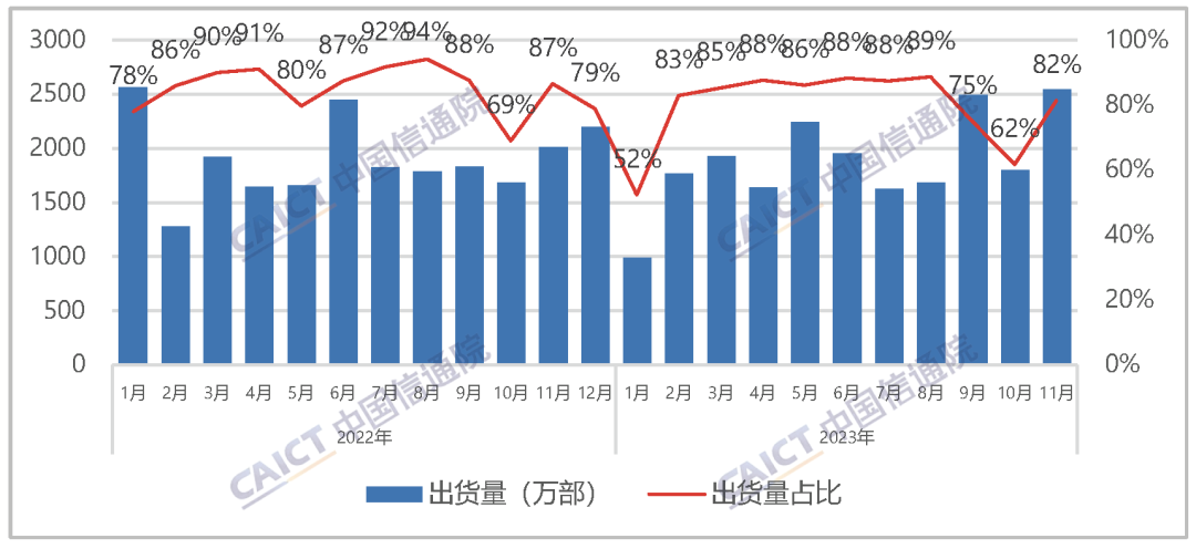 2023年1-11月,國內市場手機總體出貨量累計2.61億部,同比增長7.1%,其中,5G手機出貨量2.15億部,同比增長12.9%,占同期手機出貨量的82.5%。