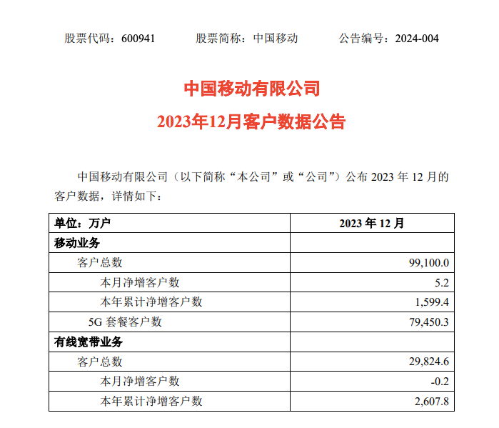 中國移動剛剛公布2023年12月份運營數據,當月,中國移動移動客戶數凈增5.2萬戶,用戶總數達到9.91億戶。