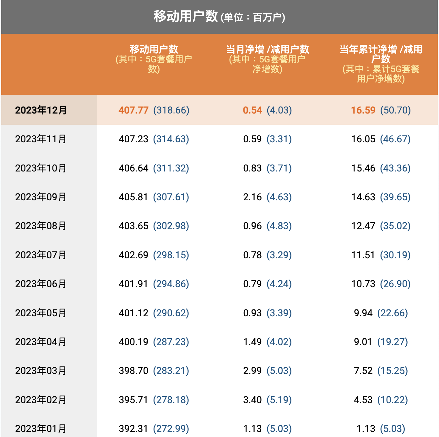 近日,中國電信公布了2023年12月主要運營數據。當月,中國電信移動用戶數凈增54萬戶,移動用戶數累計4.0777億戶。其中,5G套餐用戶凈增403萬戶,5G套餐用戶數累計3.1866億戶。