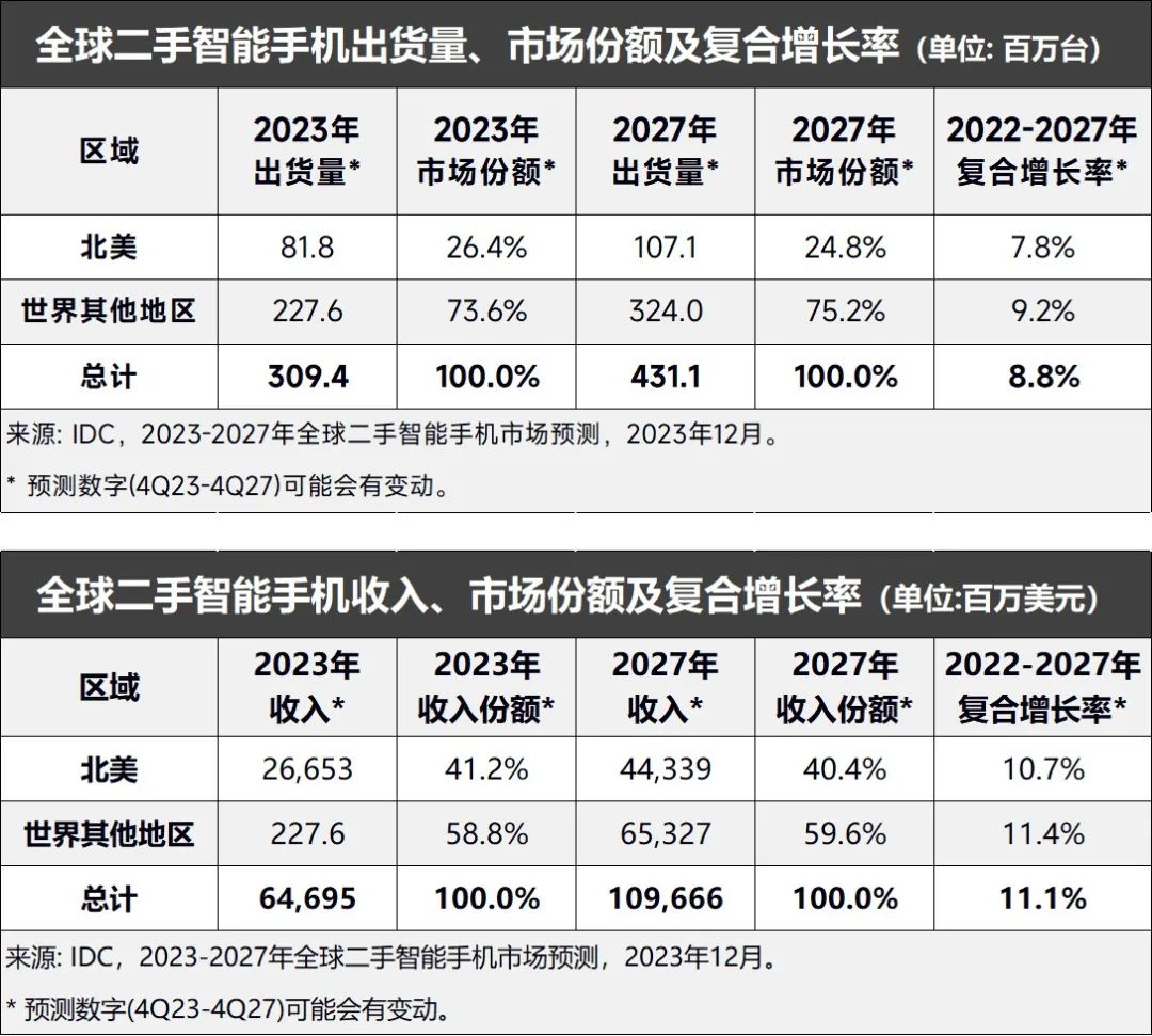 根據IDC估計,2023年全球二手智能手機(包括官方翻新和二手智能手機)的出貨量將達到3.094億部。與2022年的2.826億臺相比,銷量增長9.5%。此外,IDC 預計2027年二手智能手機出貨量將達到4.311億臺,2022年至2027 年的年復合增長率(CAGR)為8.8%。