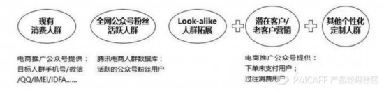 針對電商類公眾號推出服務,公眾號/電商品牌提供現有用戶群體手機號/微信號等識別數據,再利用騰訊電商人群數據庫,通過look-alike技術實現人群拓展,實現個性化定制人群挖掘&投放。相對而言,精準性更高。