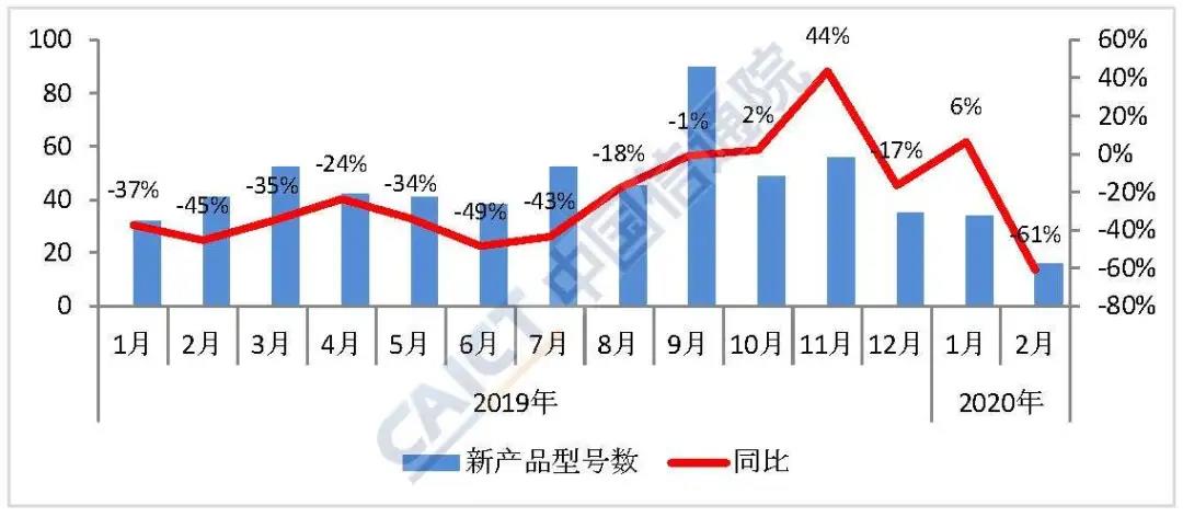 2020年2月,國內手機市場上市新機型16款,同比下降61.0%,其中2G手機1款、4G手機4款、5G手機11款。2020年1-2月,上市新機型50款,同比下降31.5%,其中2G手機9款、4G手機22款、5G手機19款。