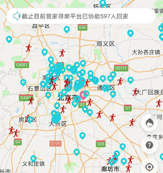 圖上的每一個紅色小人都代表著有一個人走失(藍色坐標是沒有照片的走失信息),每一個走失的人的背后都是一個悲傷的故事。圖來自小程序普家尋親。
