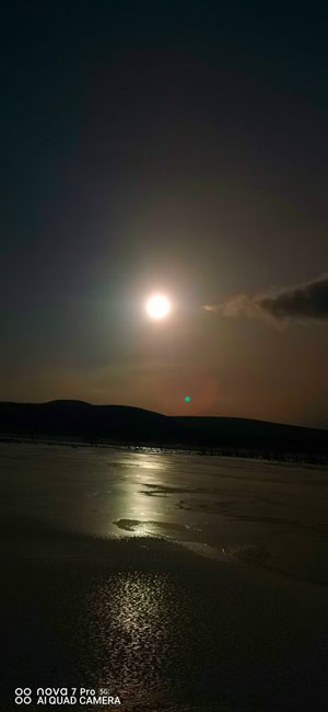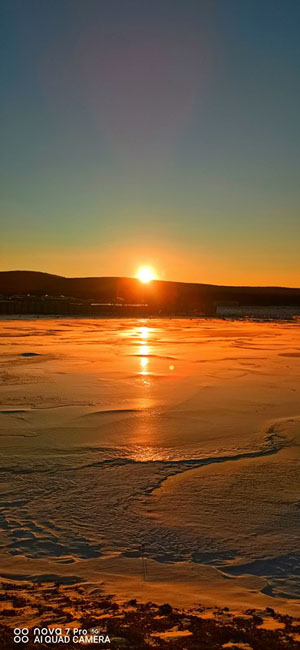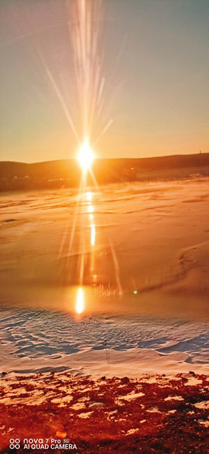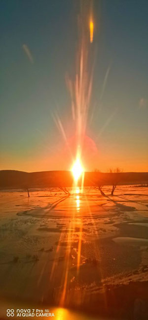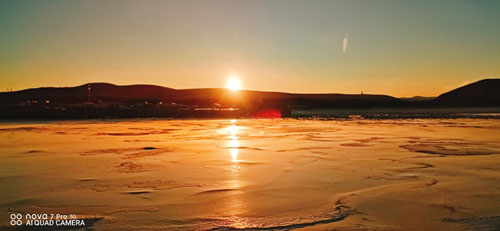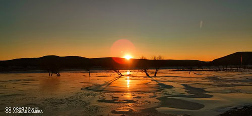 一道殘陽鋪水中,半江瑟瑟半江紅。冰與火,在漸離漸遠的不舍中,碰撞出燦爛耀眼的光芒。火樹銀花般綻放的璀璨,讓冰河有了大海的氣勢,而冰河的冷艷,讓如血的殘陽,美到極致。
