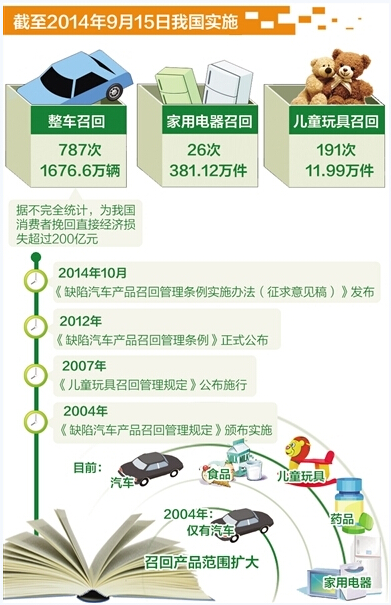 10年前,因為沒有建立召回制度,汽車廠商針對汽車產品存在的缺陷,不是置之不理,就是以“免費保養”、“回饋行動”等名義私下“大事化小、小事化了”;國外汽車廠商往往把中國排除在“召回”之外。2004年我國頒布實施《缺陷汽車產品召回管理規定》,10年來,這一狀況得到了改變。國家質檢總局法規司司長許新建說,“我國汽車召回制度的建立,填補了法律空白,有效保護了我國汽車消費者應有的權益。”