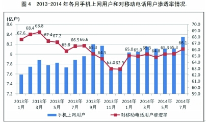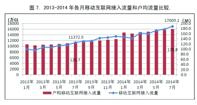 移動互聯網接入流量超過10億G,手機上網方式貢獻八成以上流量。三家基礎電信企業加大4G業務的促銷力度,不斷降低流量資費單價,推動移動互聯網流量保持高速增長。1~7月,移動互聯網接入流量達10.36億G,同比增長56.1%,2014年以來每月同比增長均超過50%。月戶均移動互聯網接入流量達到178.8M,同比增長48%。作為主要拉動因素,手機上網流量達8.76億G,同比增長95.9%,在移動互聯網接入流量中的占比達到84.6%。全國固定互聯網使用量同期保持較快增長,固定寬帶接入時長達23.1萬億分鐘,同比增長29.8%。