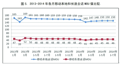移動話音業務量和用戶增長持續失衡,移動本地通話量受沖擊明顯。1~7月,全國移動電話去話通話時長17074.6億分鐘,同比增長2.1%,分別比上年同期、1~6月下降3.5與0.1個百分點。其中,移動本地和移動長途去話通話時長同比增長1.7%與3.3%,分別比上年同期下降3.8、2.6個百分點。移動話音業務量和用戶增長繼續呈現失衡狀態,但增速差距由1~6月的5個百分點縮小至4.4個百分點。每用戶月均貢獻的移動語音業務量與上月持平,但同比持續下降,移動本地去話MOU值為149.9分鐘/月·戶,移動長途去話MOU值為45.5分鐘/月·戶,同比分別下降6.3%、4.9%。